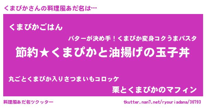 | 男性向けラノベタイトル風あだ名 | 『くまぴかの憂鬱』『クマピカスレイヤー』 |