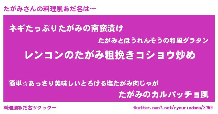 | 意味不明あだ名 | 『自称たがみ』『ペロリンたがみ』 |