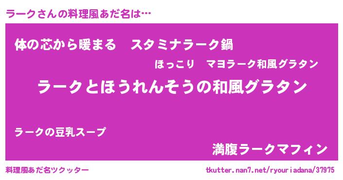 | 男性向けラノベタイトル風あだ名 | 『ラーク~年齢イコール彼女いない歴の魔法使い~』 |