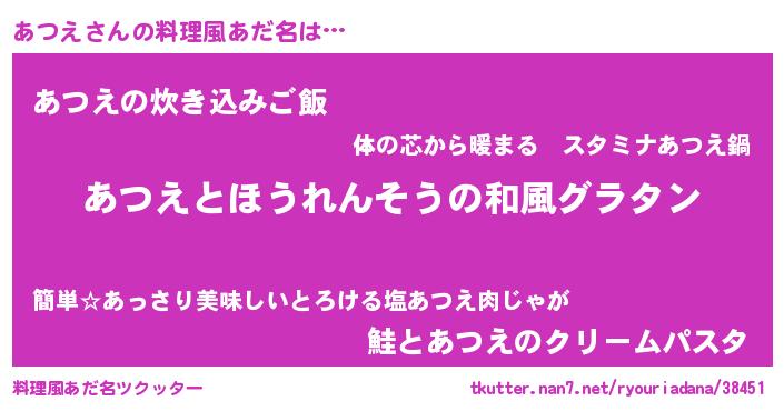 | ヘコむあだ名 | 『なまこ酢』『あつえ(爆)』 |