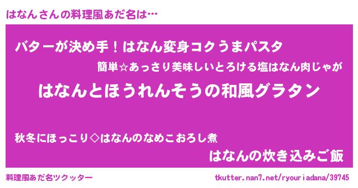 | 女子向けラノベタイトル風あだ名 | 『はなんの玉の輿計画!』『はなん恋絵巻』 |