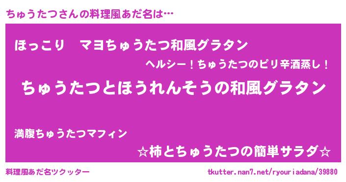 | 男性向けラノベタイトル風あだ名 | 『転生したらちゅうたつだった件』 |