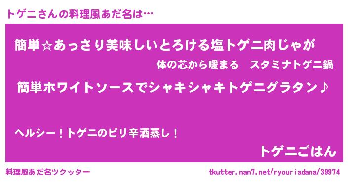 | 胡散臭い通販商品みたいなあだ名 | 『全米が絶賛したサプリメント…その名も「トゲニ」』 |