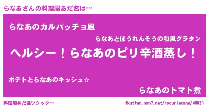 | 男性向けラノベタイトル風あだ名 | 『Re:らなあから始める異世界生活』 |