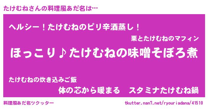 | ヘコむあだ名 | 『たけもー』『レバニラ』『たけを』 |