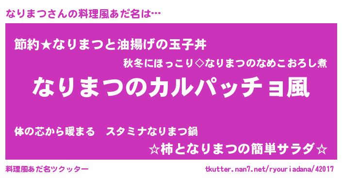 | 男性向けラノベタイトル風あだ名 | 『魔弾の王となりまつ』『なりまつの憂鬱』 |