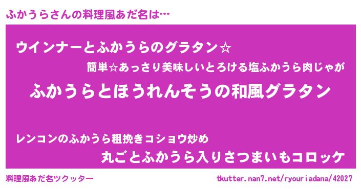 | 女子向けラノベタイトル風あだ名 | 『ふかうらの玉の輿計画!』 |