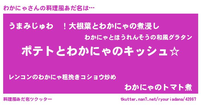 | 女子向けラノベタイトル風あだ名 | 『わかにゃの卵を拾いまして』 |