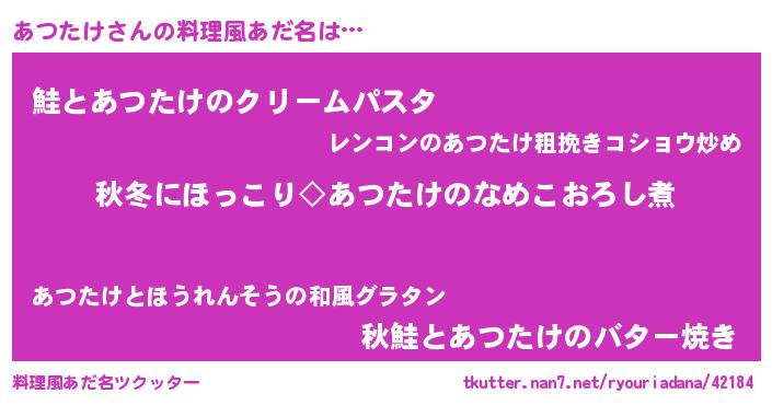 | 男性向けラノベタイトル風あだ名 | 『あつたけに滅ぼされるだけの簡単なお仕事です』 |