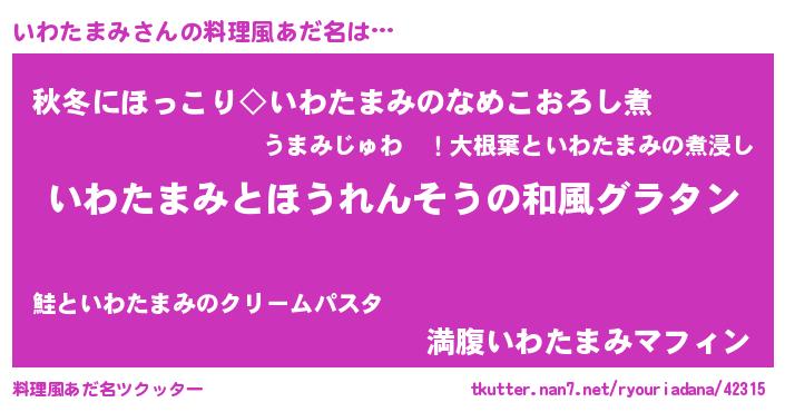 | 男性向けラノベタイトル風あだ名 | 『いわたまみ~年齢イコール彼女いない歴の魔法使い~』 |
