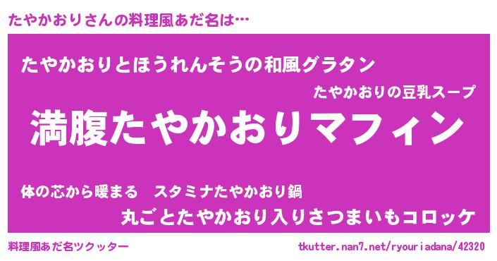 | 女子向けラノベタイトル風あだ名 | 『異世界で失敗しない100のたやかおり』 |