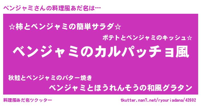 | 意味不明あだ名 | 『住所不定無職ベンジャミ(85歳)』 |