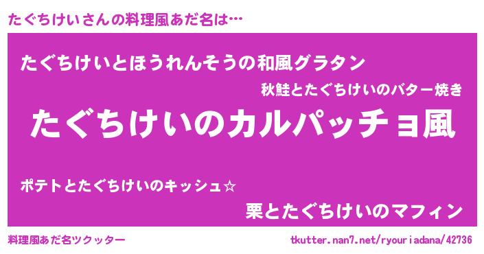 | 女子向けラノベタイトル風あだ名 | 『たぐちけいが死なない童話 林檎のたぐちけいの診療簿』 |