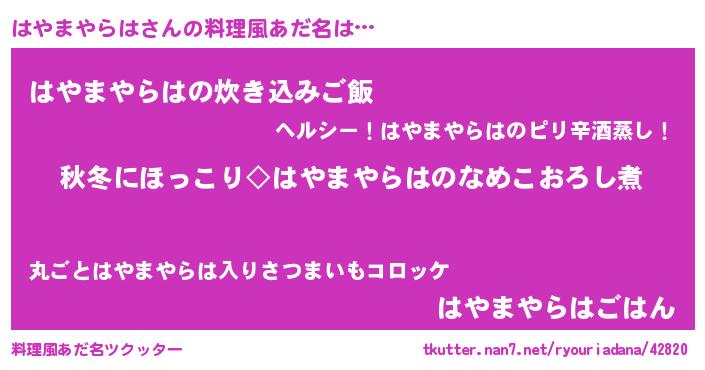 | 男性向けラノベタイトル風あだ名 | 『はやまやらはに滅ぼされるだけの簡単なお仕事です』 |