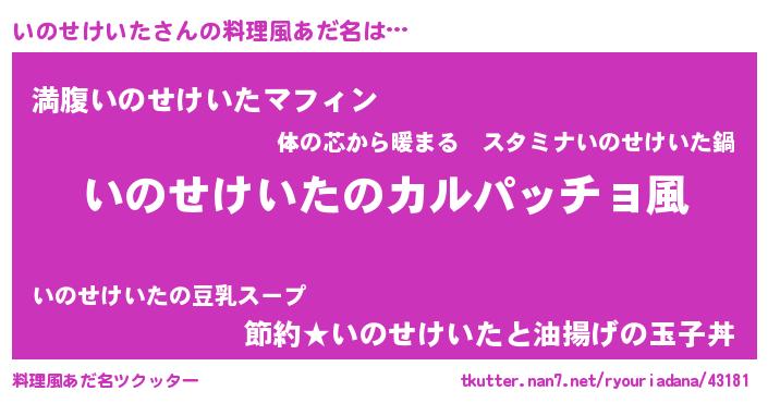 | 女子向けラノベタイトル風あだ名 | 『いのせけいたが死なない童話 林檎のいのせけいたの診療簿』 |