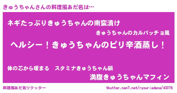 | 男性向けラノベタイトル風あだ名 | 『Re:きゅうちゃんから始める異世界生活』 |