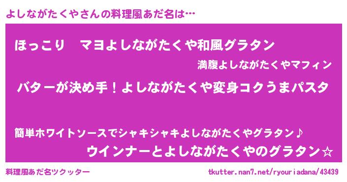 | ヘコむあだ名 | 『なまこ酢』『よしながたくや(笑)』 |