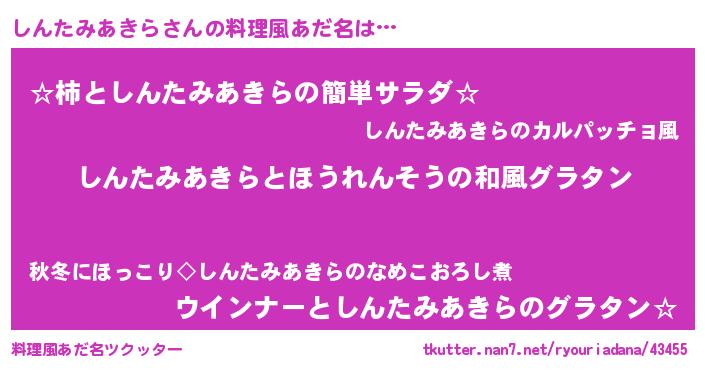| 男性向けラノベタイトル風あだ名 | 『しんたみあきら~年齢イコール彼女いない歴の魔法使い~』 |