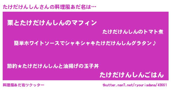 | 男性向けラノベタイトル風あだ名 | 『たけだけんしんの嫁は女の子じゃないと思った?』 |