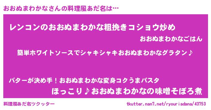 | 男性向けラノベタイトル風あだ名 | 『おおぬまわかなの嫁は女の子じゃないと思った?』 |