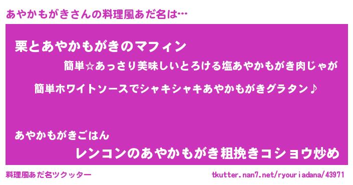 | 男性向けラノベタイトル風あだ名 | 『あやかもがきの嫁は女の子じゃないと思った?』 |