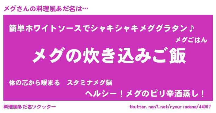 | ピコ太郎風あだ名 | 『メグ五郎』『ピメ一郎』『メメ太郎』 |