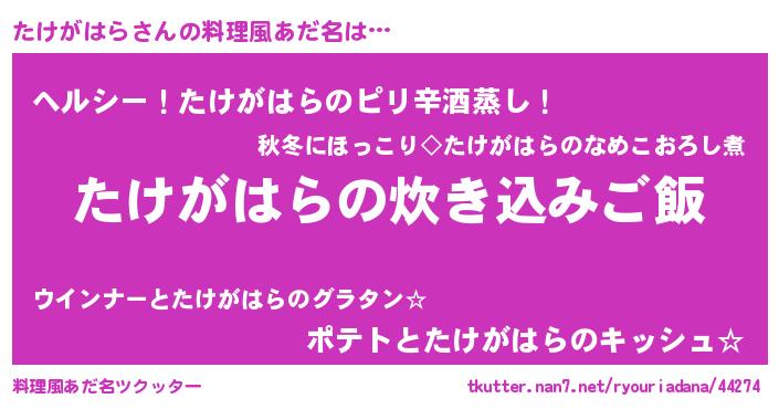 | 意味不明あだ名 | 『自称たけがはら』『永久保存たけがはら』 |