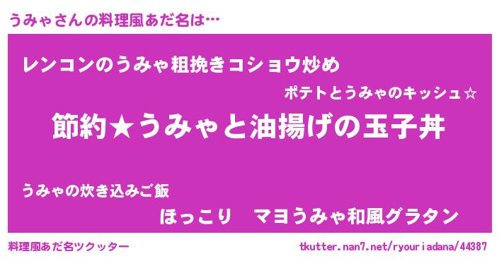 | 男性向けラノベタイトル風あだ名 | 『うみゃの憂鬱』『魔法科高校のうみゃ』 |