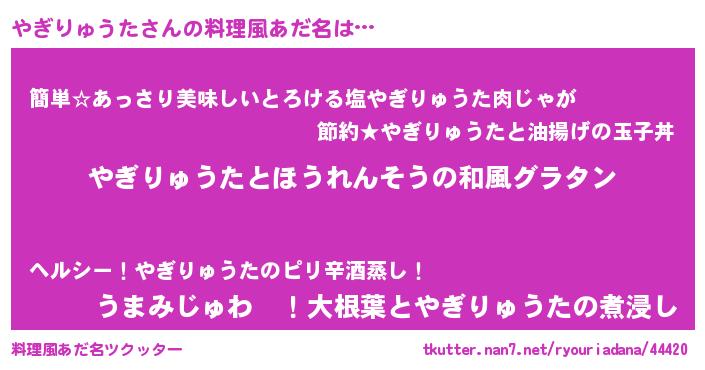 | ヘコむあだ名 | 『やぎりゅうた(震え声)』『酢こんぶ』 |
