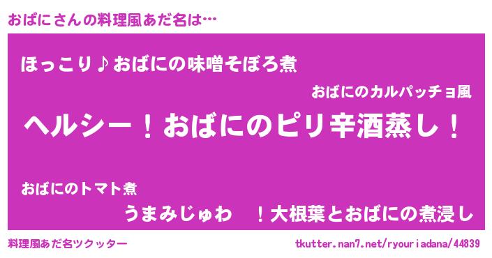 | 男性向けラノベタイトル風あだ名 | 『Re:おばにから始める異世界生活』 |