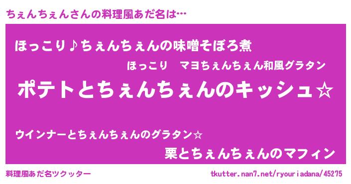 | 男性向けラノベタイトル風あだ名 | 『ちぇんちぇんの嫁は女の子じゃないと思った?』 |