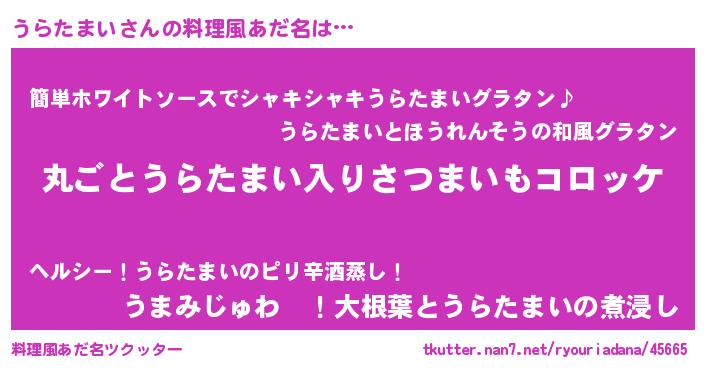 | 男性向けラノベタイトル風あだ名 | 『魔弾の王とうらたまい』 |