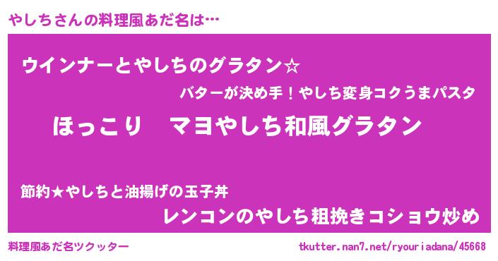 | ヒーロー風カッコイイあだ名 | 『仮面ヤシダー』『ウルトラやしちマン』 |