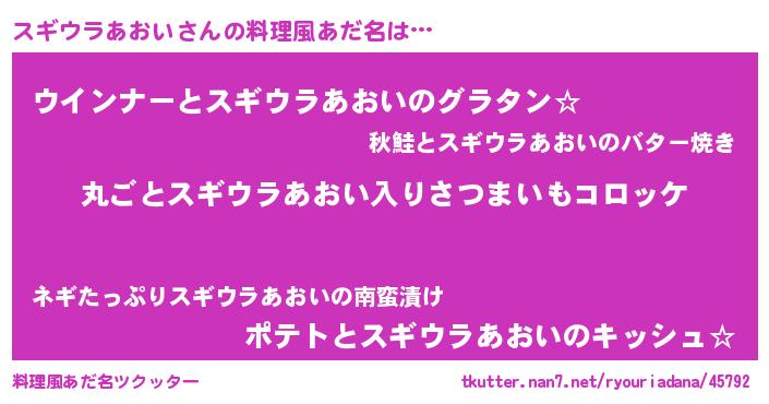 | 意味不明あだ名 | 『住所不定無職スギウラあおい(56歳)』 |