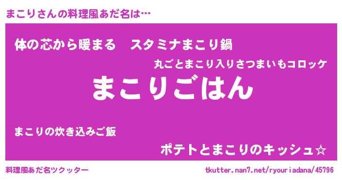 | 男性向けラノベタイトル風あだ名 | 『転生したらまこりだった件』 |