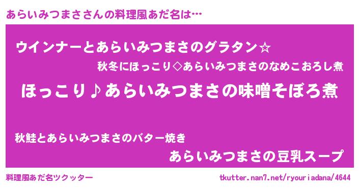 | 女子向けラノベタイトル風あだ名 | 『(仮)あらいみつまさのやんごとなき事情』 |
