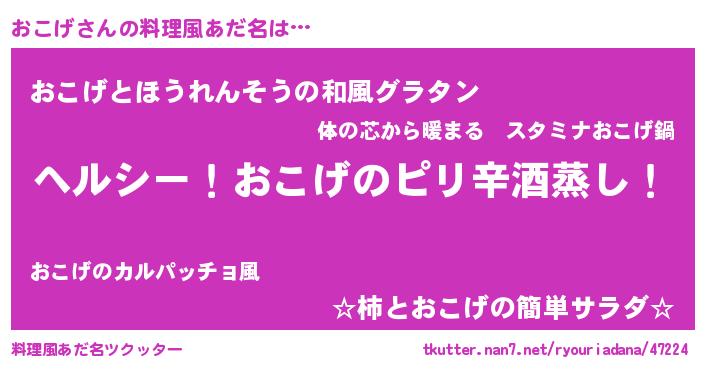 | 男性向けラノベタイトル風あだ名 | 『Re:おこげから始める異世界生活』 |