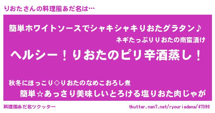 | 男性向けラノベタイトル風あだ名 | 『Re:りおたから始める異世界生活』 |