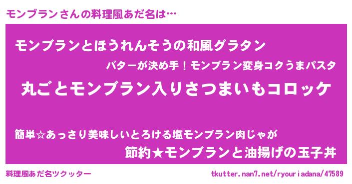 | 女子向けラノベタイトル風あだ名 | 『乙女ゲームの破滅フラグしかない悪役モンブランに転生してしまった…』 |