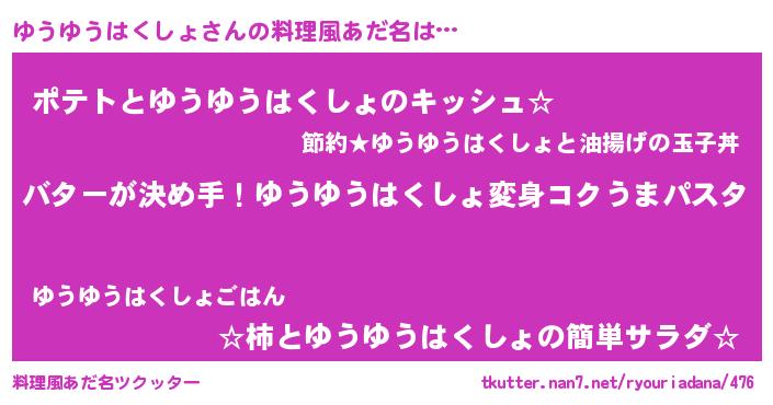 | ポケモン風あだ名 | 『ユックウザ』『ヒユウユウハクショ』 |