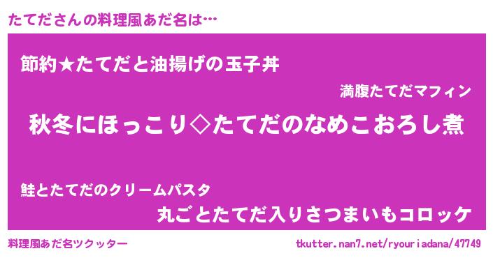 | 男性向けラノベタイトル風あだ名 | 『たてだに滅ぼされるだけの簡単なお仕事です』 |