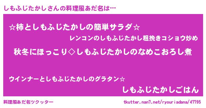 | 男性向けラノベタイトル風あだ名 | 『しもふじたかしに滅ぼされるだけの簡単なお仕事です』 |