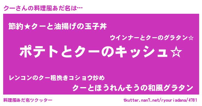| 女子向けラノベタイトル風あだ名 | 『クーの卵を拾いまして』 |