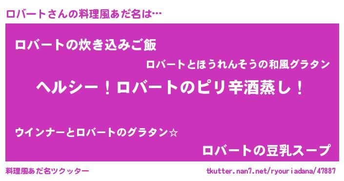 | 男性向けラノベタイトル風あだ名 | 『Re:ロバートから始める異世界生活』 |