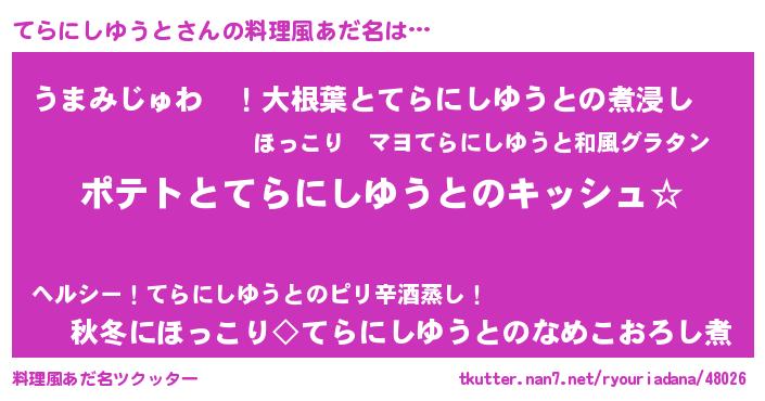 | 女子向けラノベタイトル風あだ名 | 『てらにしゆうとの卵を拾いまして』 |