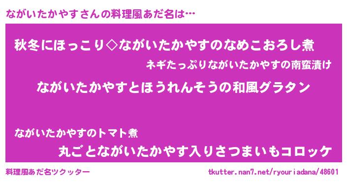 | 女子向けラノベタイトル風あだ名 | 『ながいたかやすの玉の輿計画!』 |