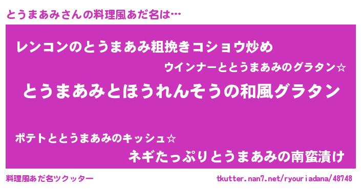 | 男性向けラノベタイトル風あだ名 | 『とうまあみ~年齢イコール彼女いない歴の魔法使い~』 |