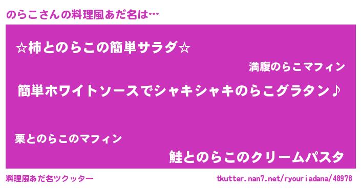| 女子向けラノベタイトル風あだ名 | 『のらこ様がみてる』『死神のらこの再婚』 |