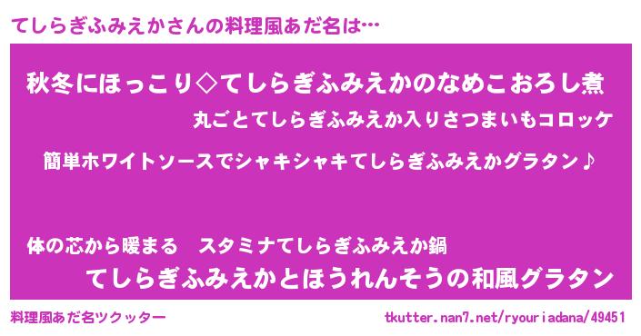| 男性向けラノベタイトル風あだ名 | 『てしらぎふみえかの嫁は女の子じゃないと思った?』 |