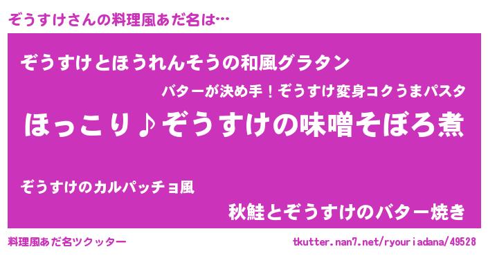 | 女子向けラノベタイトル風あだ名 | 『(仮)ぞうすけのやんごとなき事情』 |